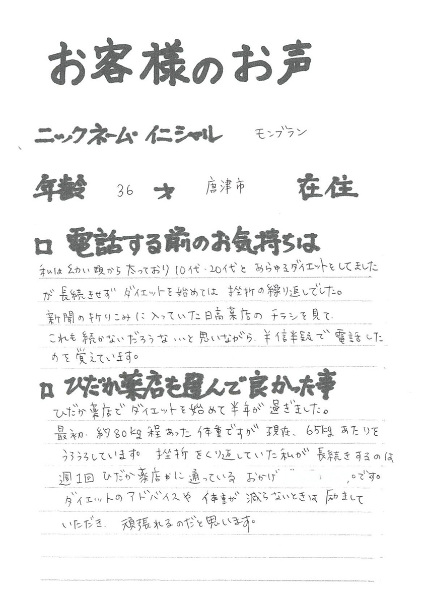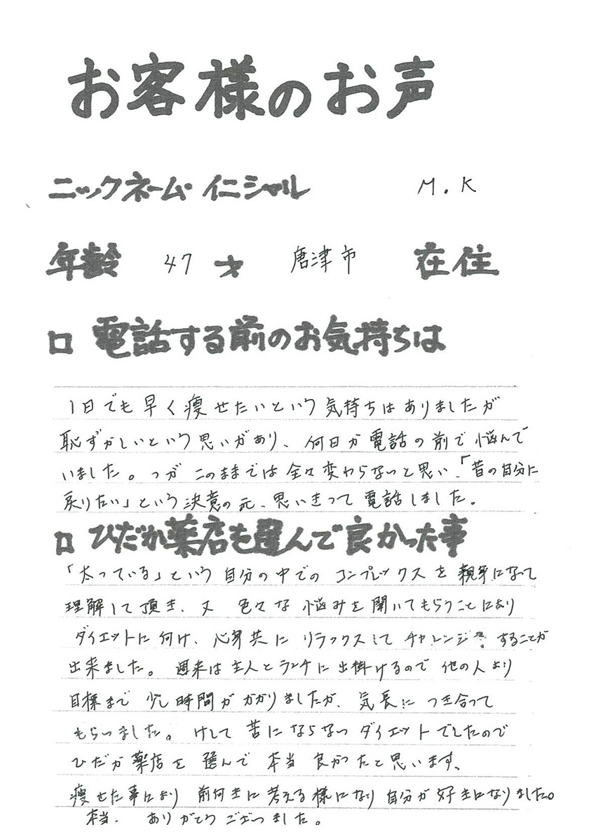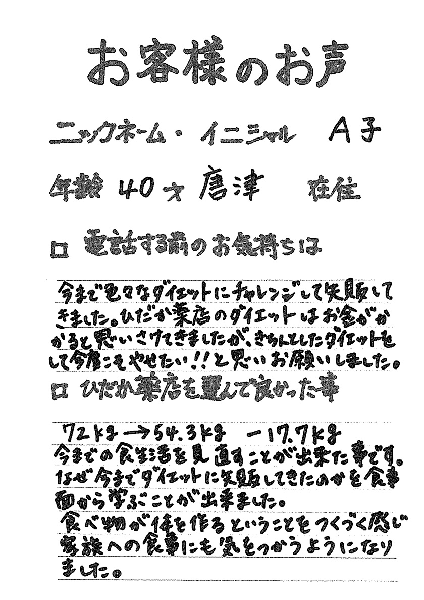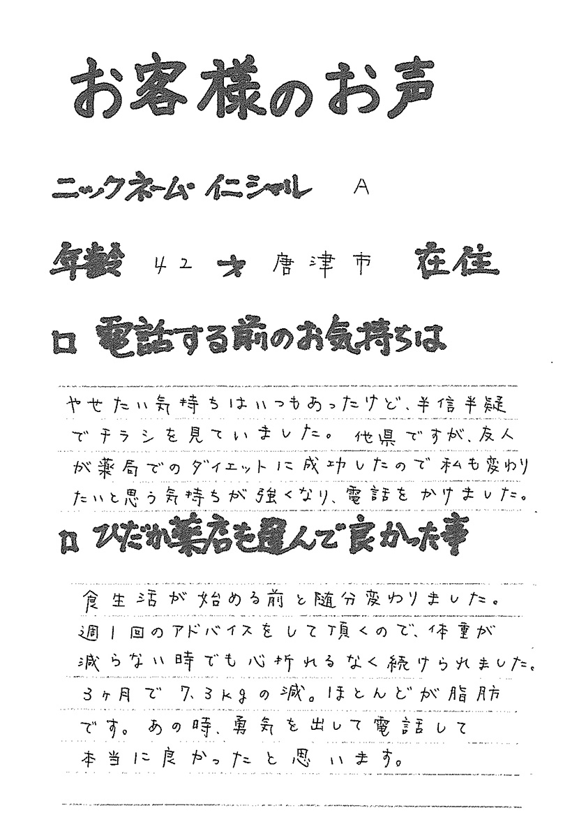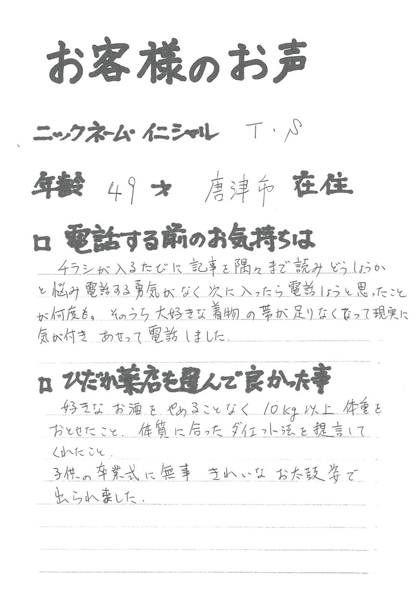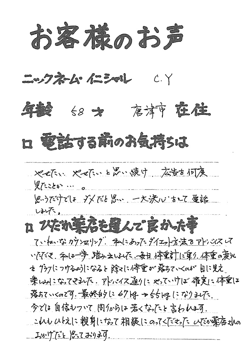 2007年53歳、まさに更年期真っ盛りの頃、今当店で扱っているダイエット商品に巡り合いました。その当時は体重計に乗るたびに1キロずつ増加。まずは、自分が試して効果があれば、積極的にお客様にも推奨できるという思いでダイエットに挑戦しました。好きなアルコールもやめず、45日間で-7キロ。後ろのチャックが上がらなかった礼服もすんなりと上がるようになるなど、身体全体が引き締まり若返ったという思いでした。70才近くになり体型は昔のままというわけにはいきませんが、今でもジーパンは、昔のサイズで履くことができます。