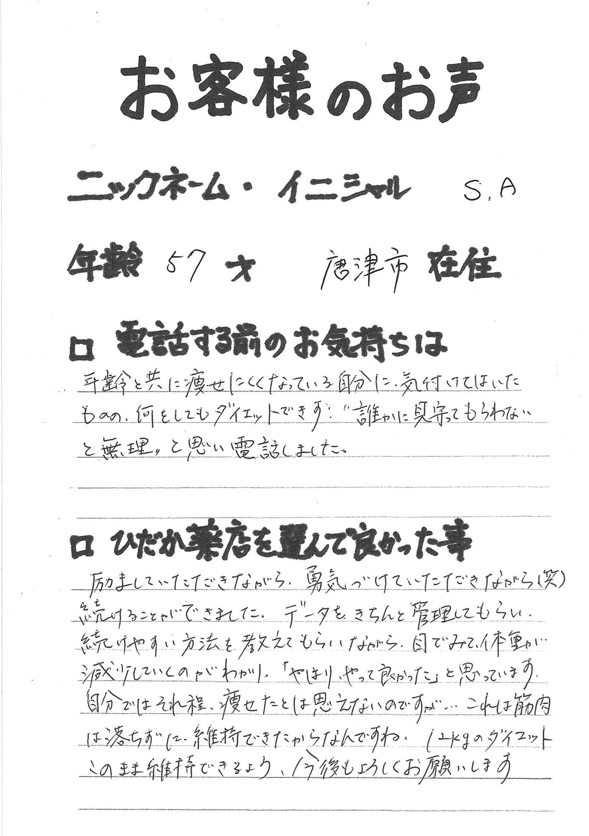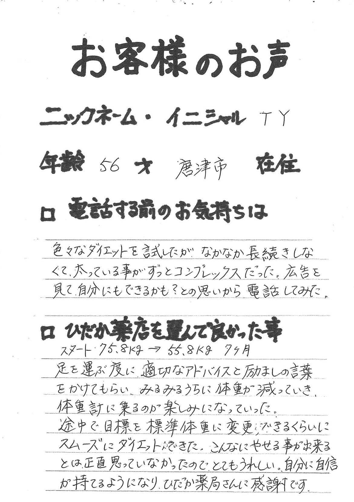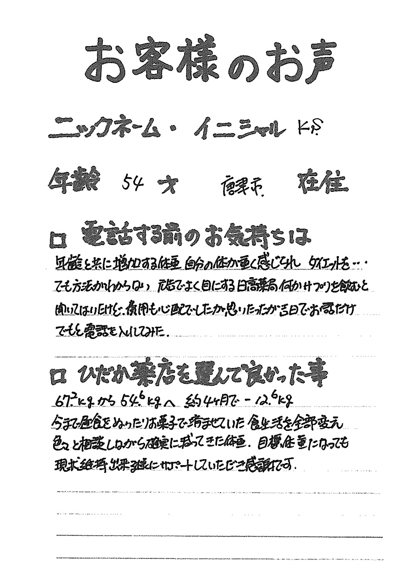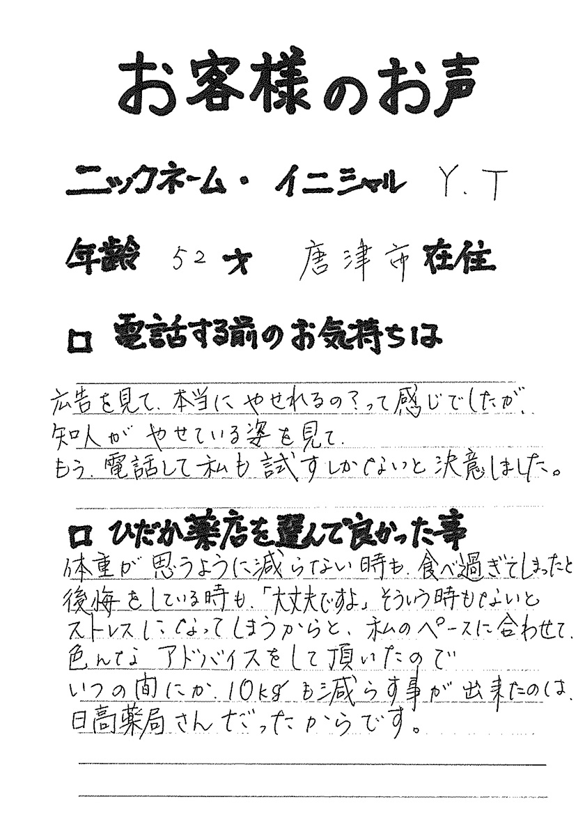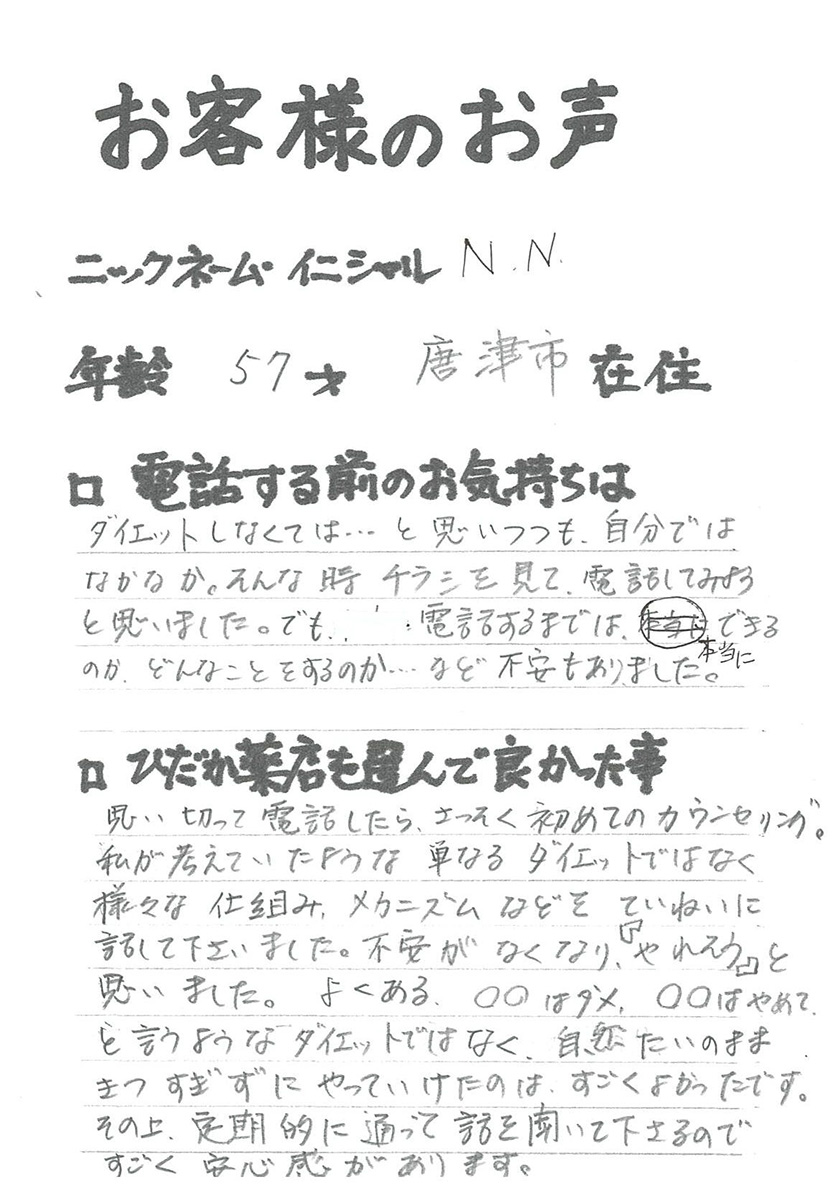 2007年53歳、まさに更年期真っ盛りの頃、今当店で扱っているダイエット商品に巡り合いました。その当時は体重計に乗るたびに1キロずつ増加。まずは、自分が試して効果があれば、積極的にお客様にも推奨できるという思いでダイエットに挑戦しました。好きなアルコールもやめず、45日間で-7キロ。後ろのチャックが上がらなかった礼服もすんなりと上がるようになるなど、身体全体が引き締まり若返ったという思いでした。70才近くになり体型は昔のままというわけにはいきませんが、今でもジーパンは、昔のサイズで履くことができます。