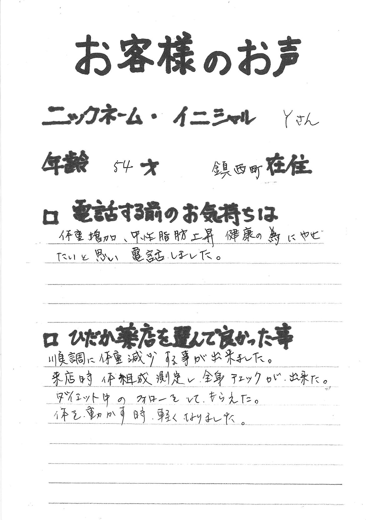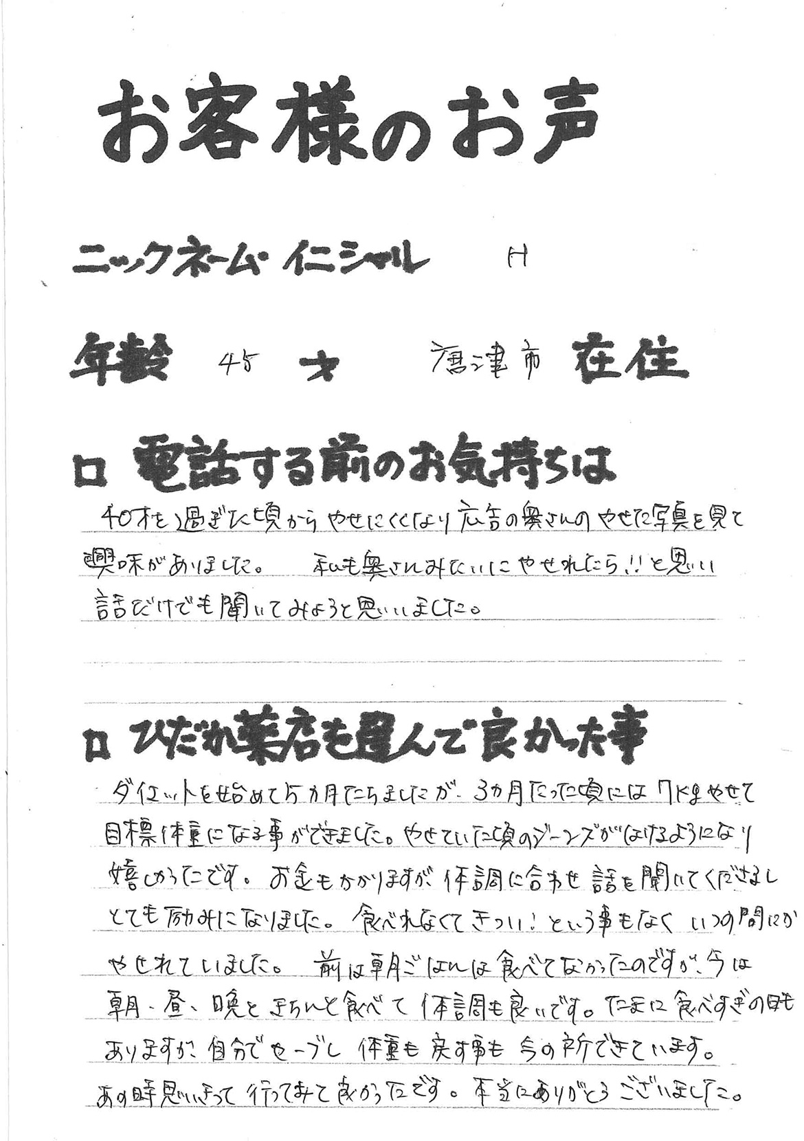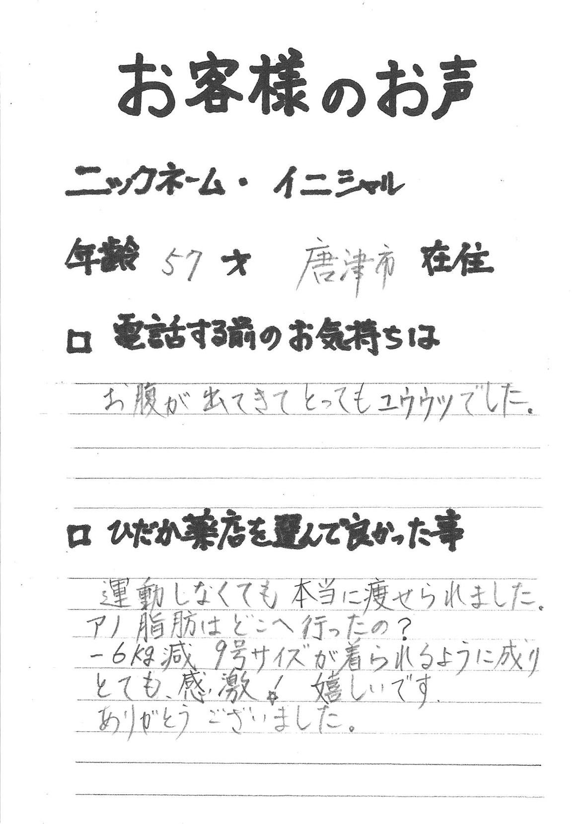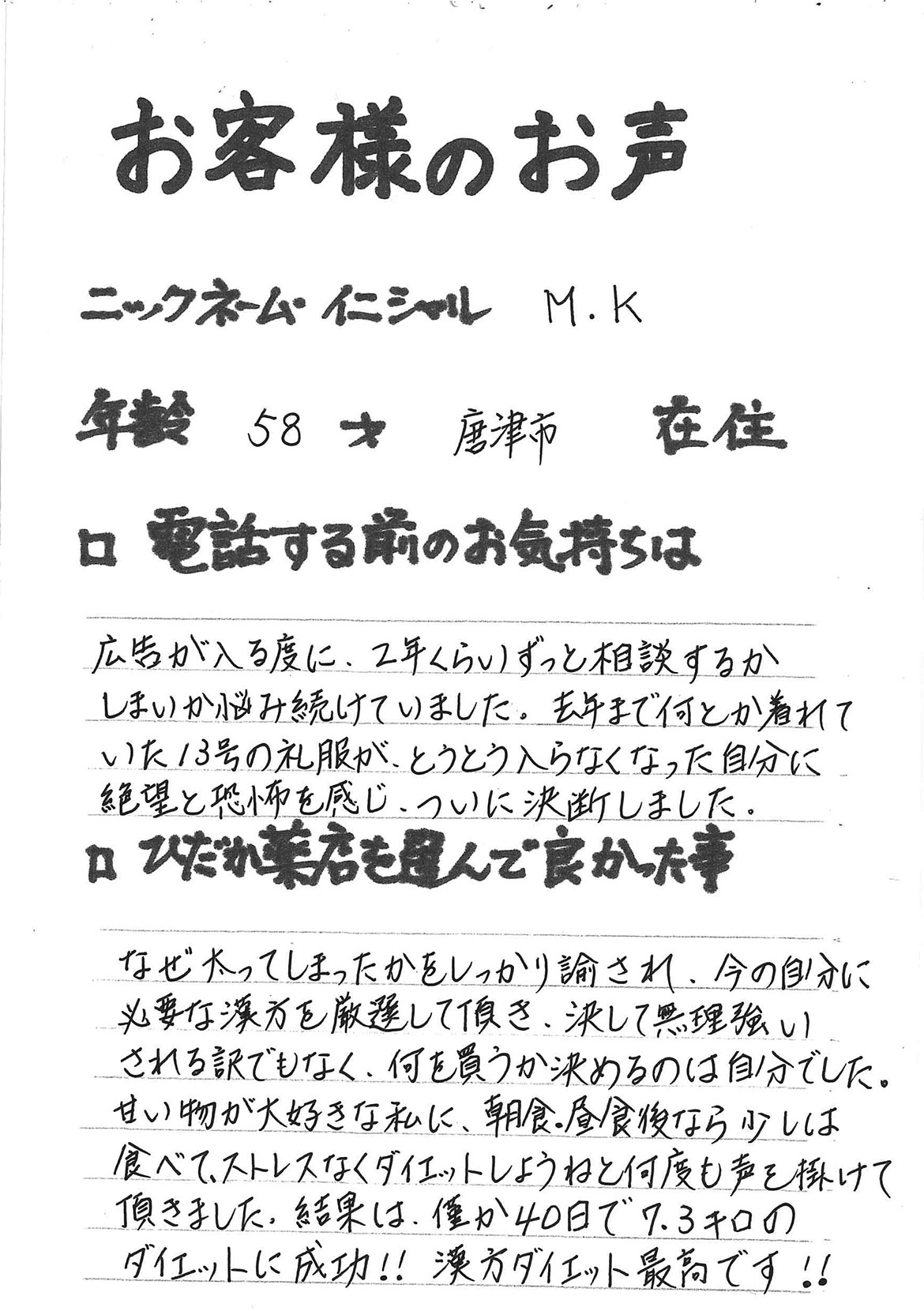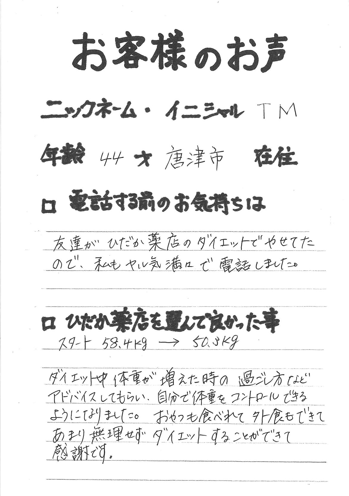 2007年53歳、まさに更年期真っ盛りの頃、今当店で扱っているダイエット商品に巡り合いました。その当時は体重計に乗るたびに1キロずつ増加。まずは、自分が試して効果があれば、積極的にお客様にも推奨できるという思いでダイエットに挑戦しました。好きなアルコールもやめず、45日間で-7キロ。後ろのチャックが上がらなかった礼服もすんなりと上がるようになるなど、身体全体が引き締まり若返ったという思いでした。70才近くになり体型は昔のままというわけにはいきませんが、今でもジーパンは、昔のサイズで履くことができます。