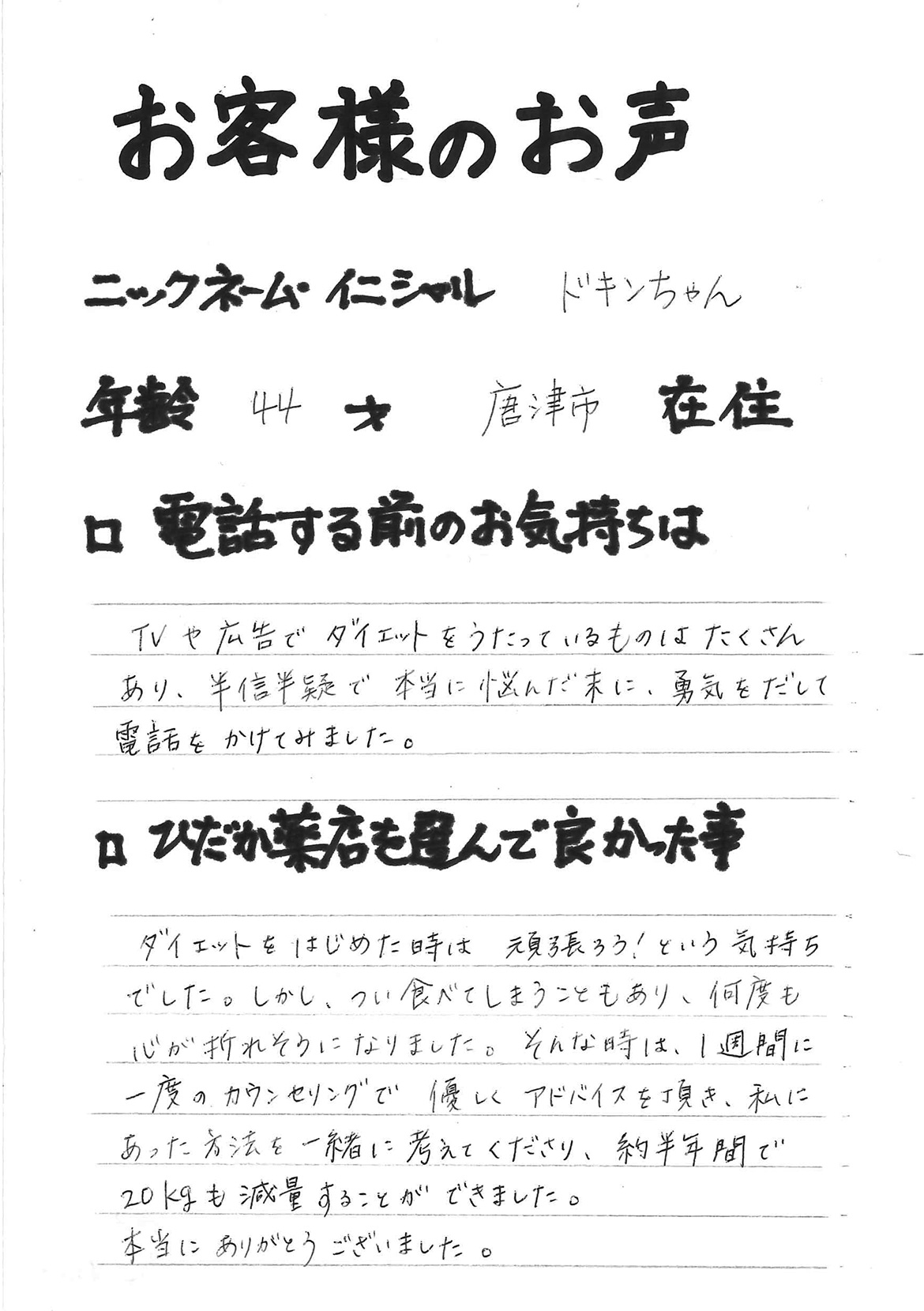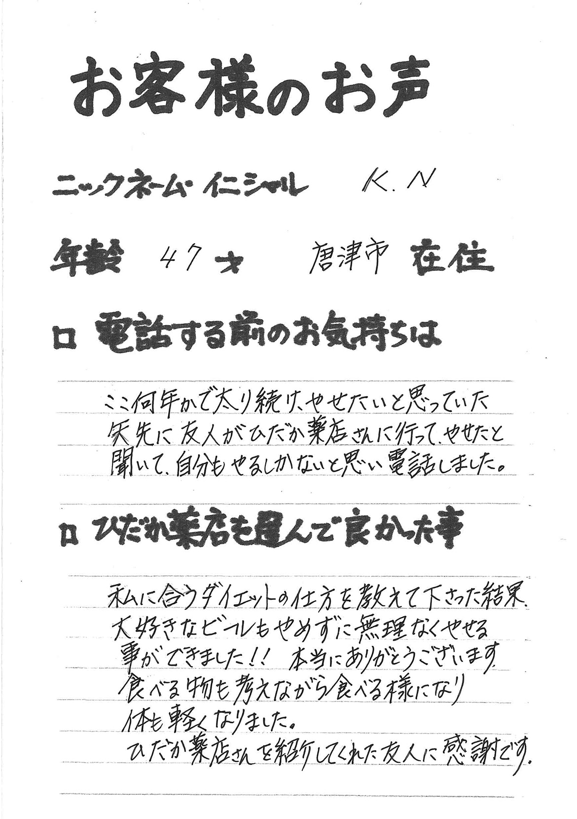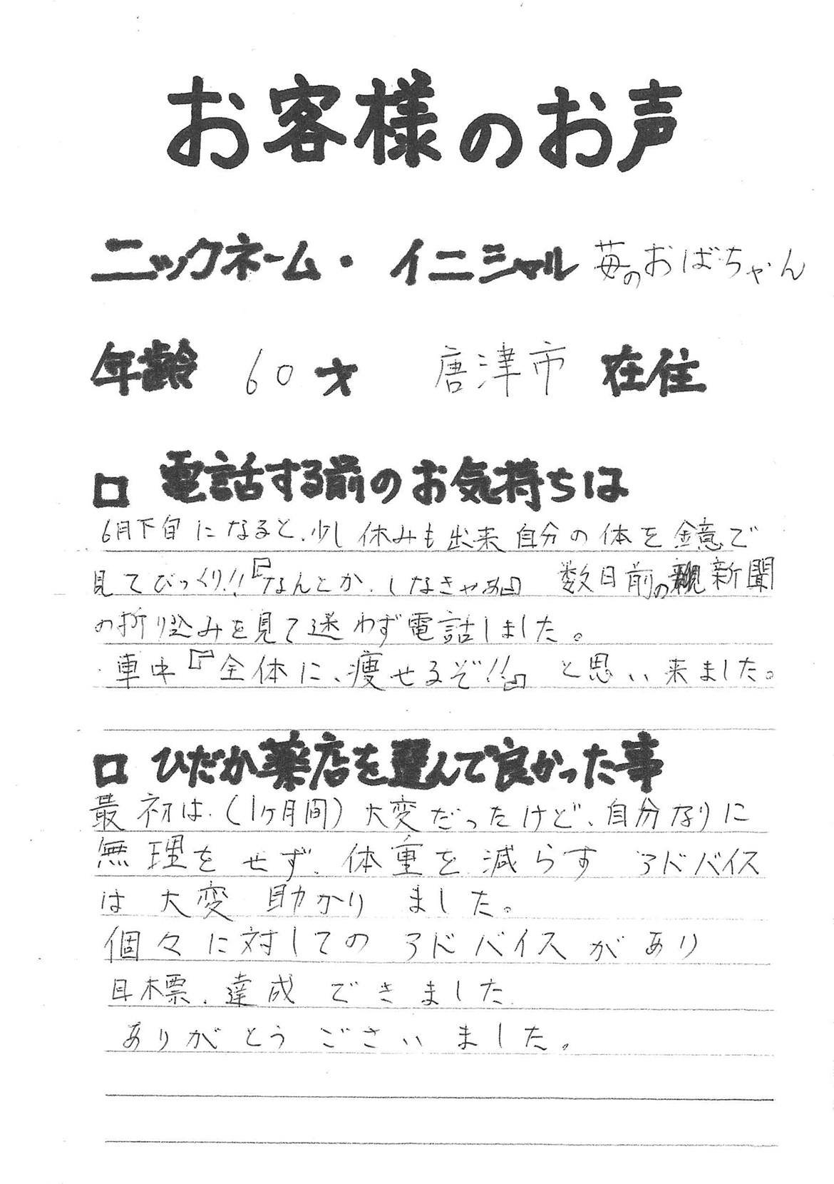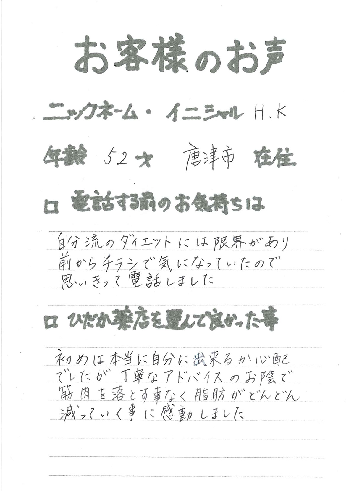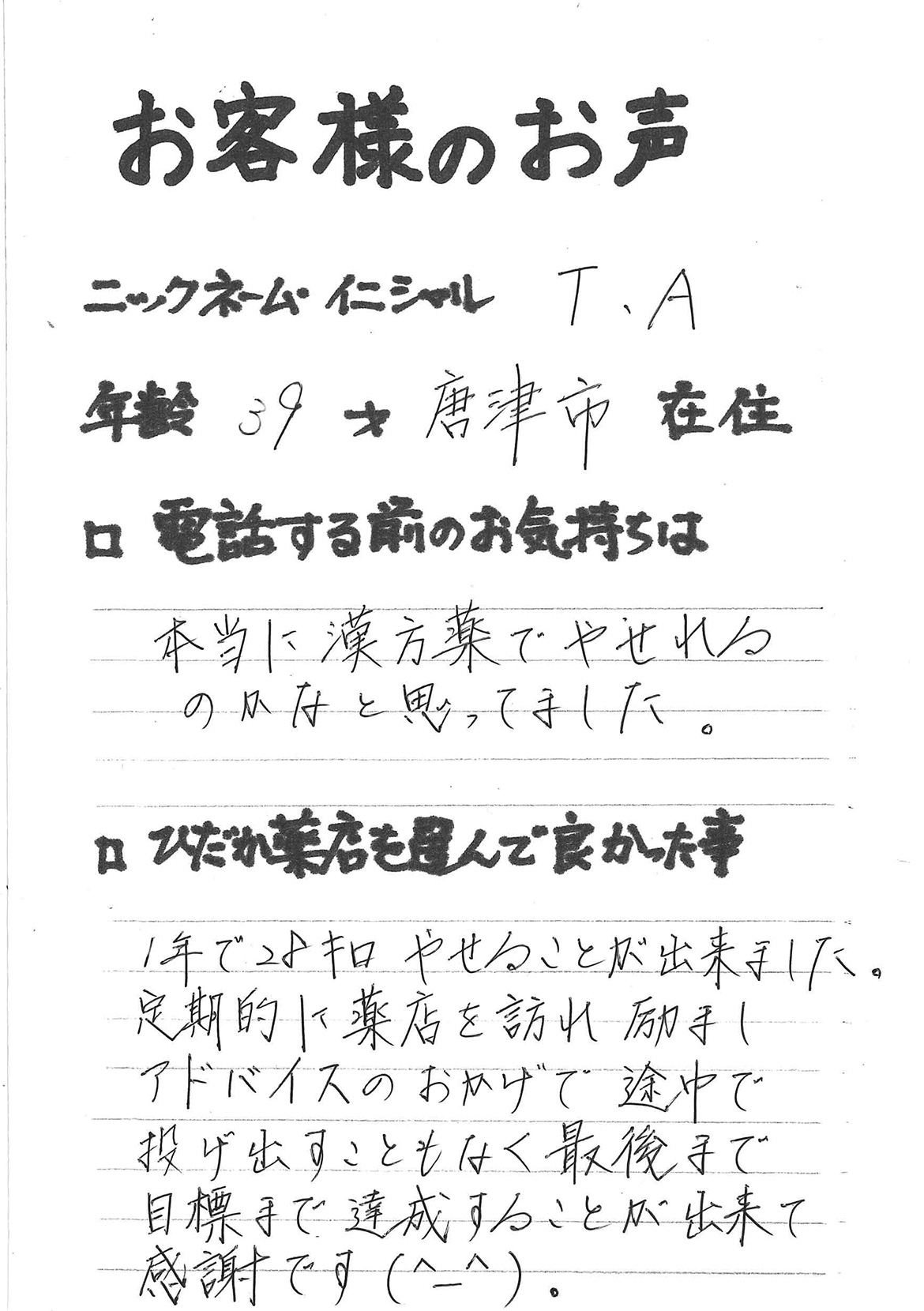 2007年53歳、まさに更年期真っ盛りの頃、今当店で扱っているダイエット商品に巡り合いました。その当時は体重計に乗るたびに1キロずつ増加。まずは、自分が試して効果があれば、積極的にお客様にも推奨できるという思いでダイエットに挑戦しました。好きなアルコールもやめず、45日間で-7キロ。後ろのチャックが上がらなかった礼服もすんなりと上がるようになるなど、身体全体が引き締まり若返ったという思いでした。70才近くになり体型は昔のままというわけにはいきませんが、今でもジーパンは、昔のサイズで履くことができます。