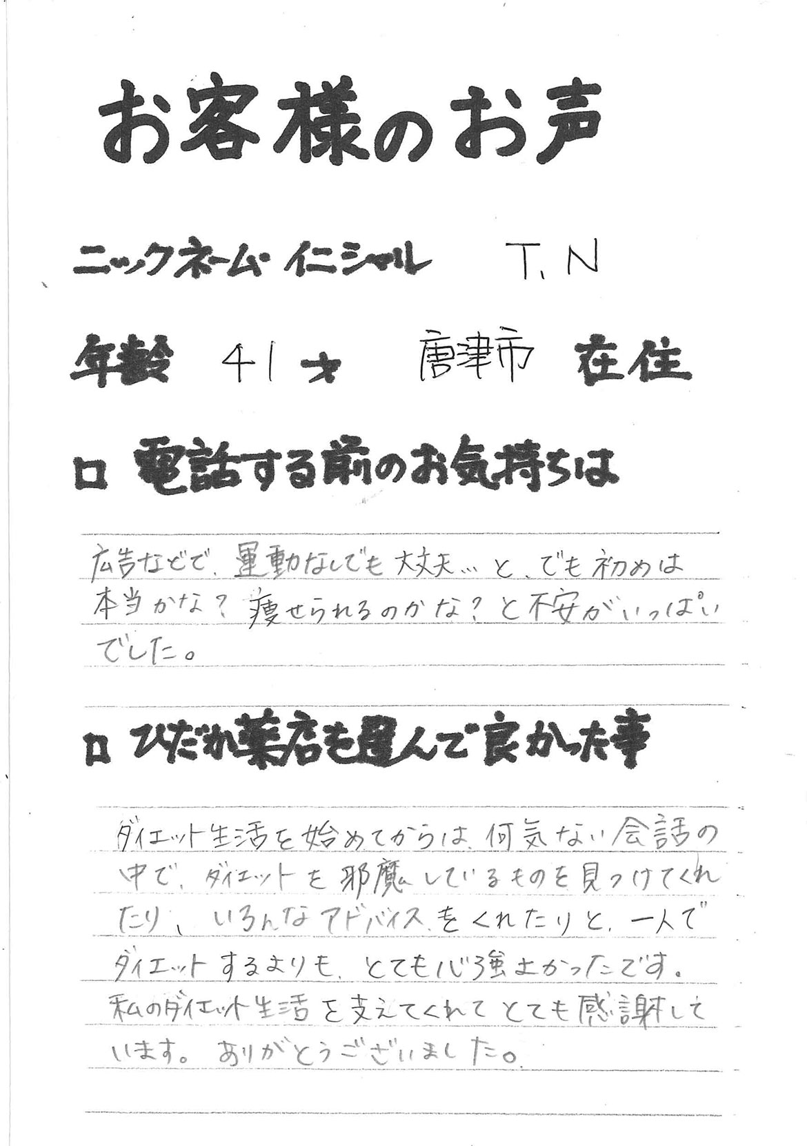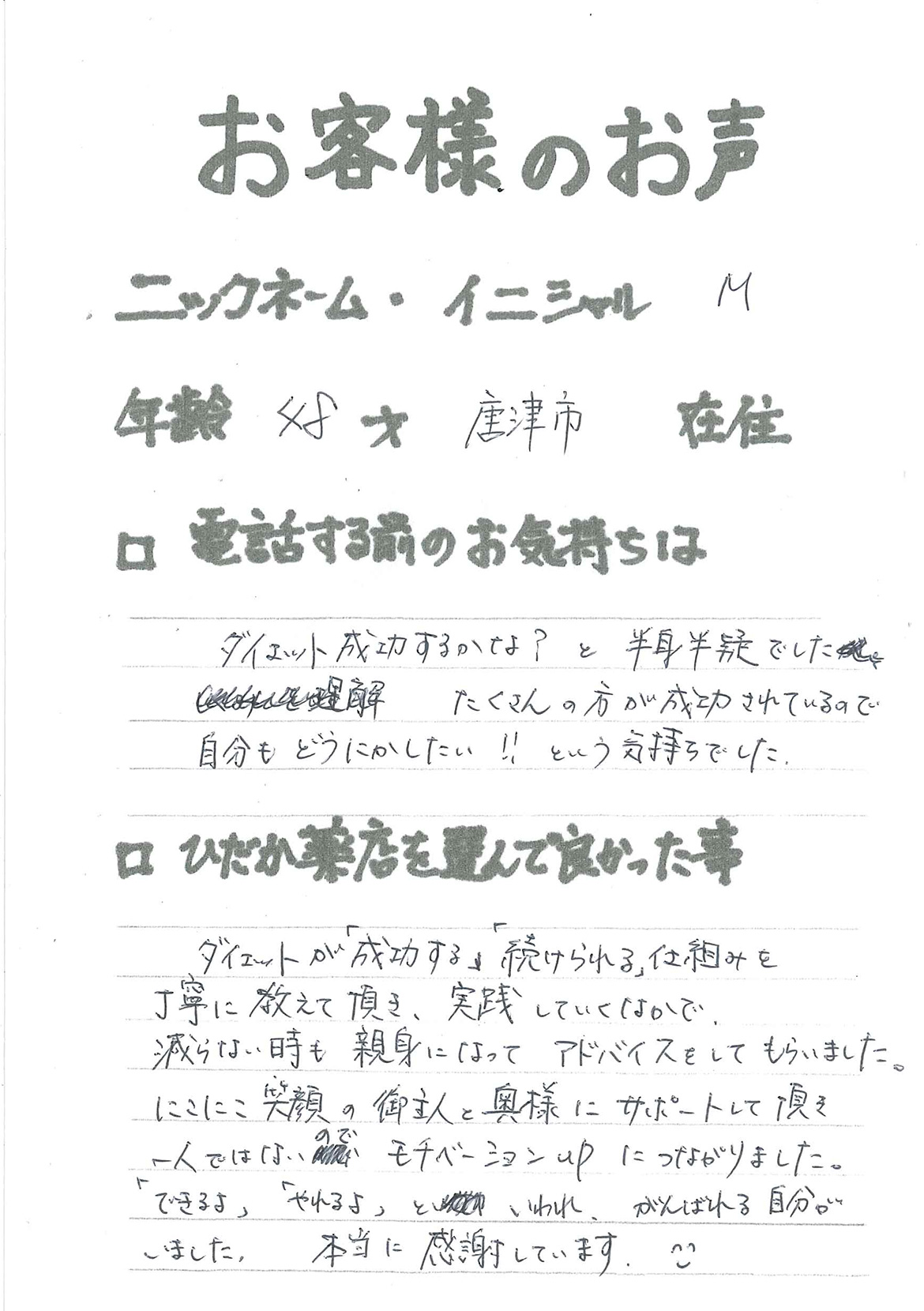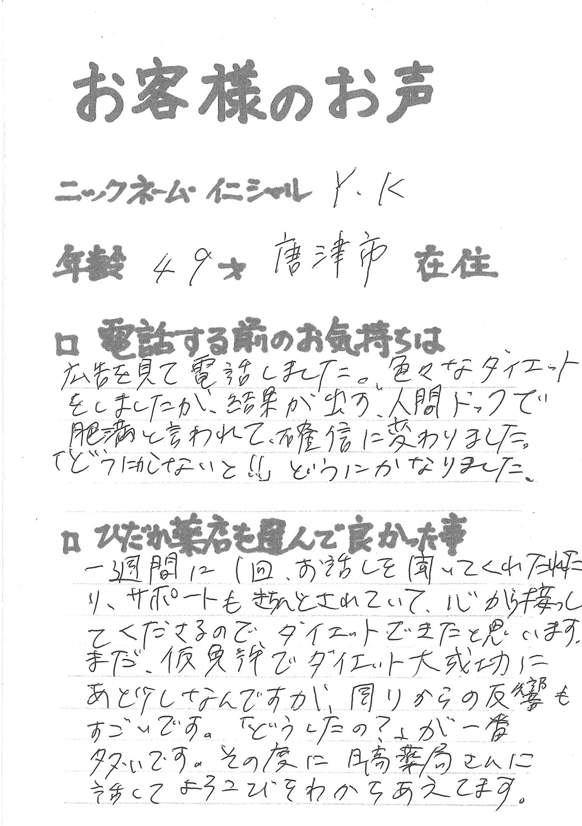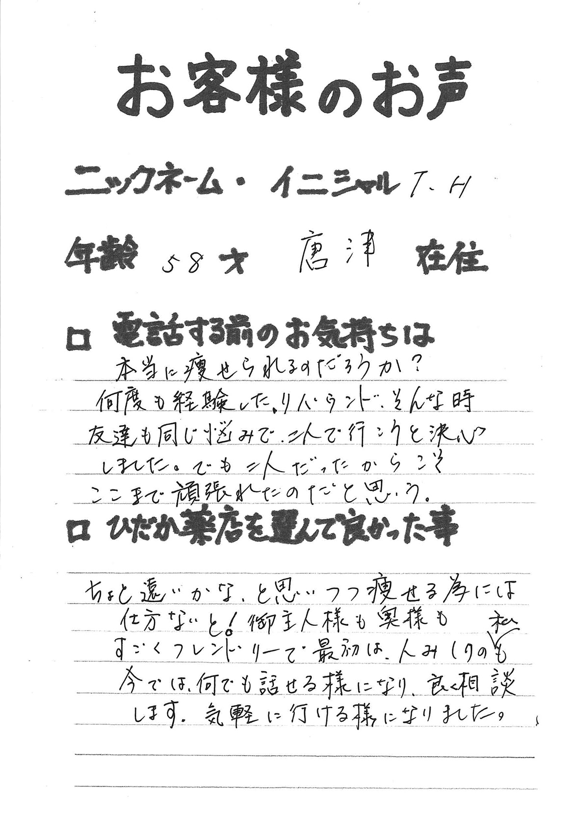2007年53歳、まさに更年期真っ盛りの頃、今当店で扱っているダイエット商品に巡り合いました。その当時は体重計に乗るたびに1キロずつ増加。まずは、自分が試して効果があれば、積極的にお客様にも推奨できるという思いでダイエットに挑戦しました。好きなアルコールもやめず、45日間で-7キロ。後ろのチャックが上がらなかった礼服もすんなりと上がるようになるなど、身体全体が引き締まり若返ったという思いでした。70才近くになり体型は昔のままというわけにはいきませんが、今でもジーパンは、昔のサイズで履くことができます。