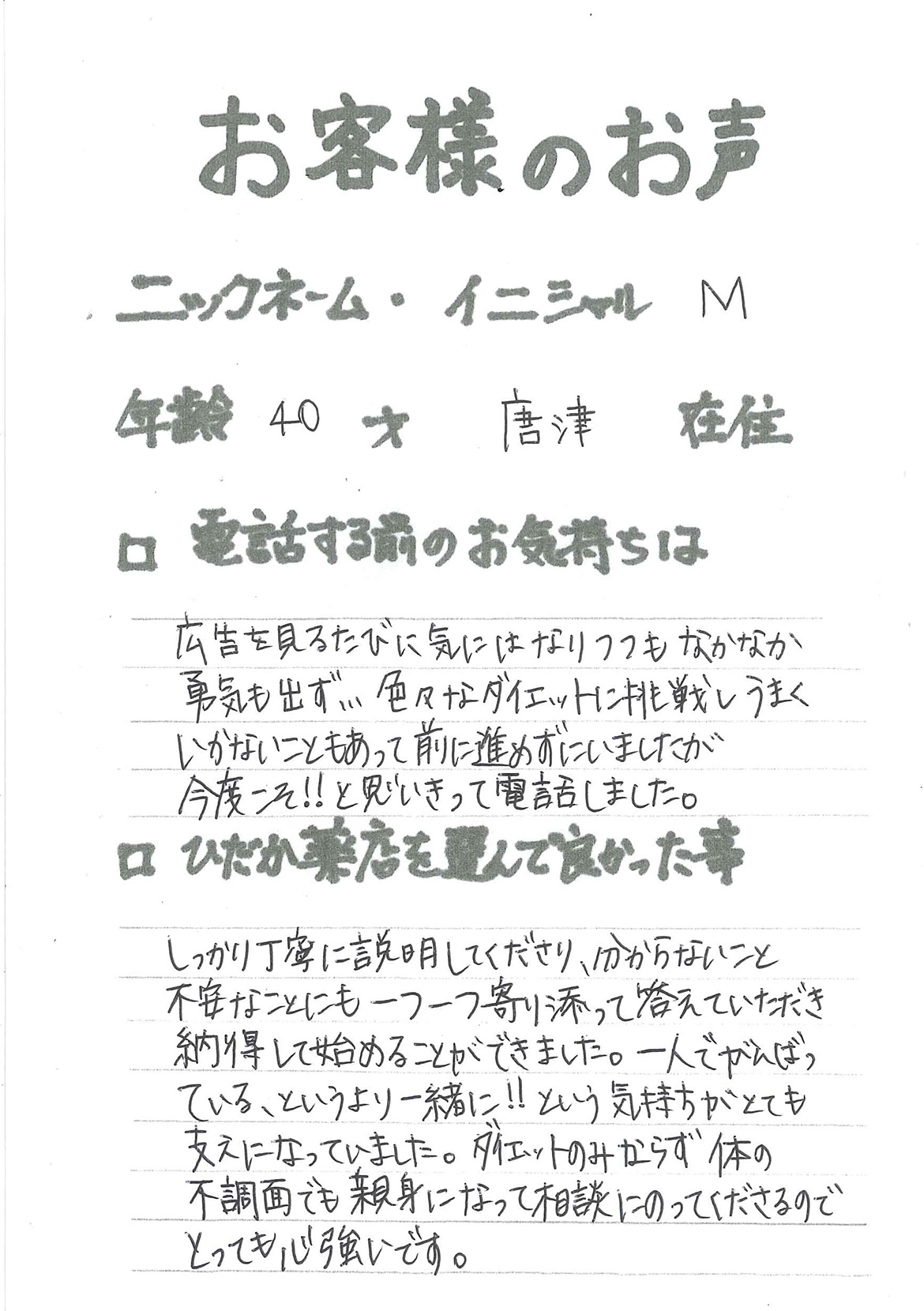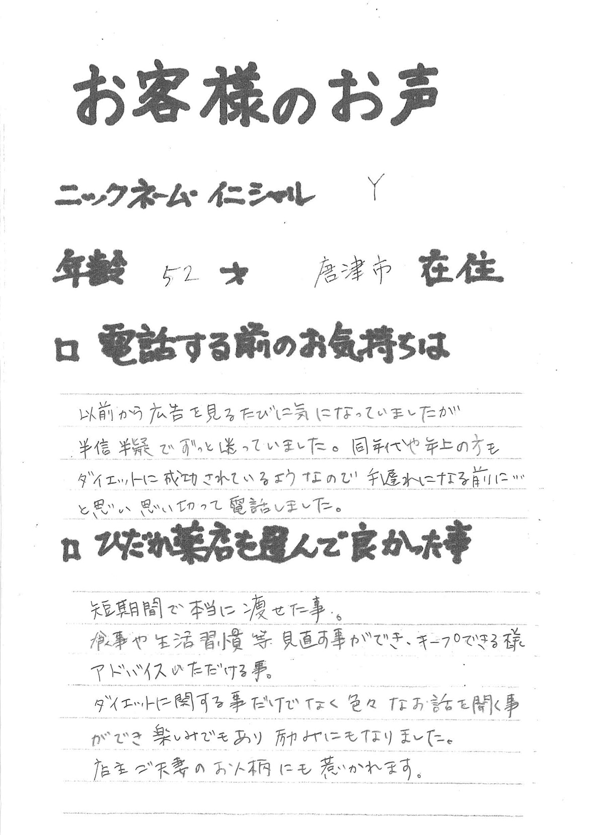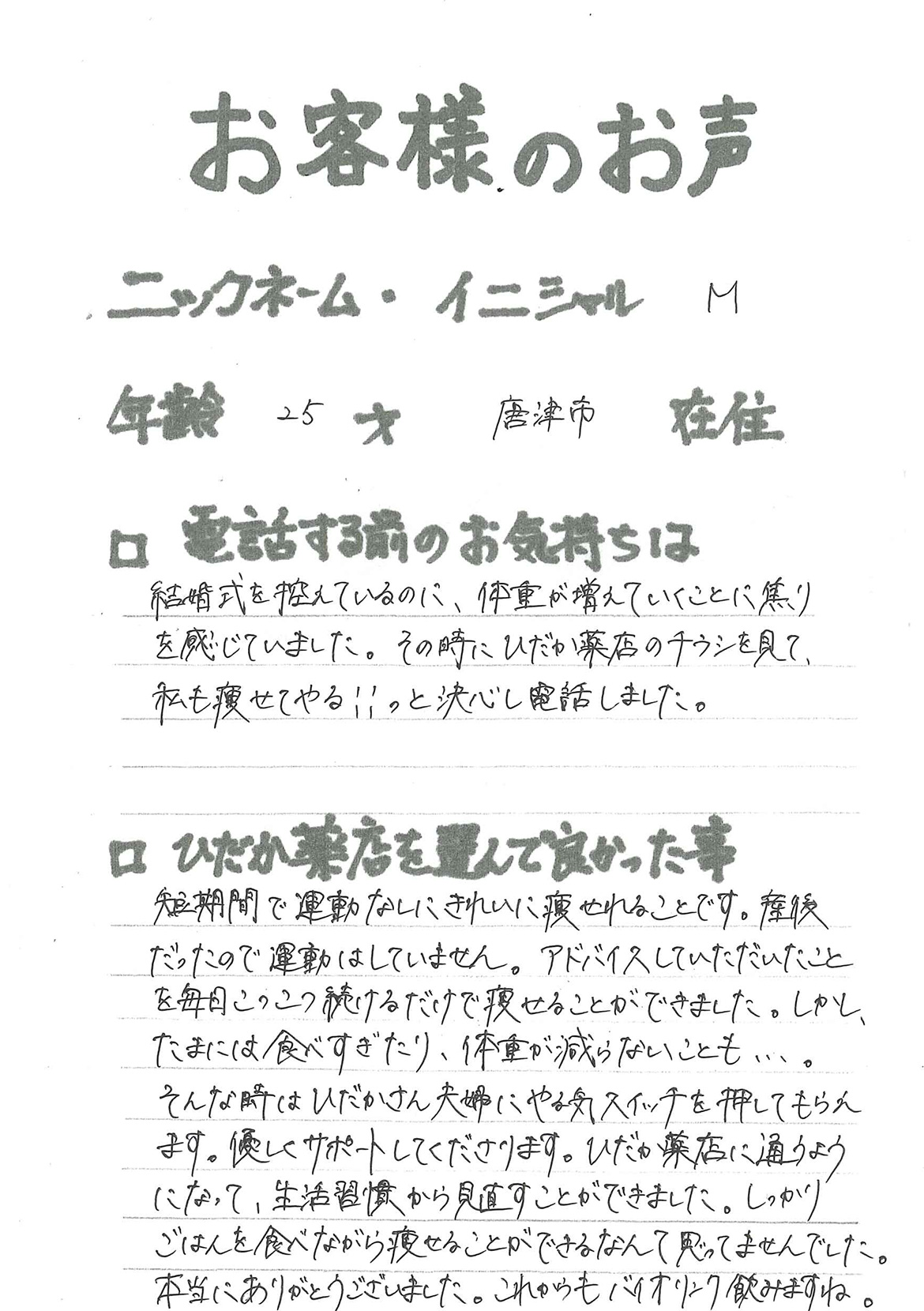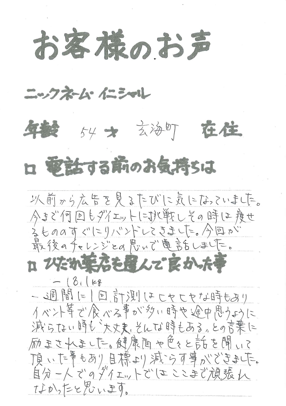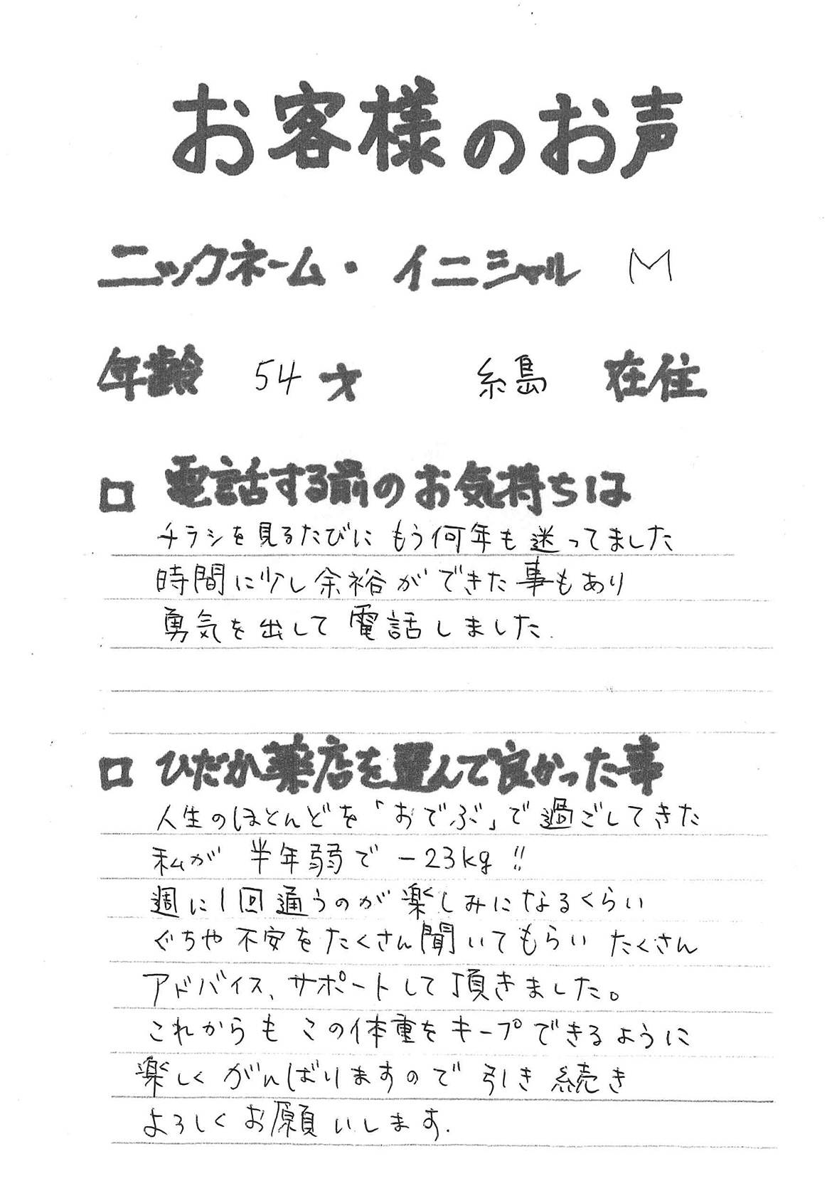 2007年53歳、まさに更年期真っ盛りの頃、今当店で扱っているダイエット商品に巡り合いました。その当時は体重計に乗るたびに1キロずつ増加。まずは、自分が試して効果があれば、積極的にお客様にも推奨できるという思いでダイエットに挑戦しました。好きなアルコールもやめず、45日間で-7キロ。後ろのチャックが上がらなかった礼服もすんなりと上がるようになるなど、身体全体が引き締まり若返ったという思いでした。70才近くになり体型は昔のままというわけにはいきませんが、今でもジーパンは、昔のサイズで履くことができます。