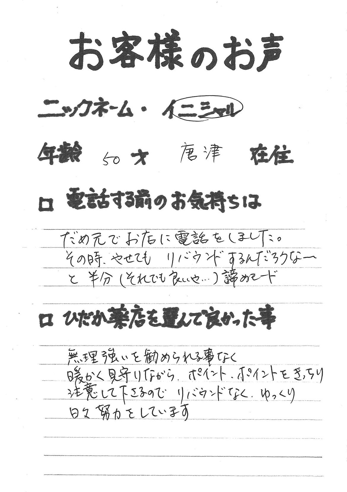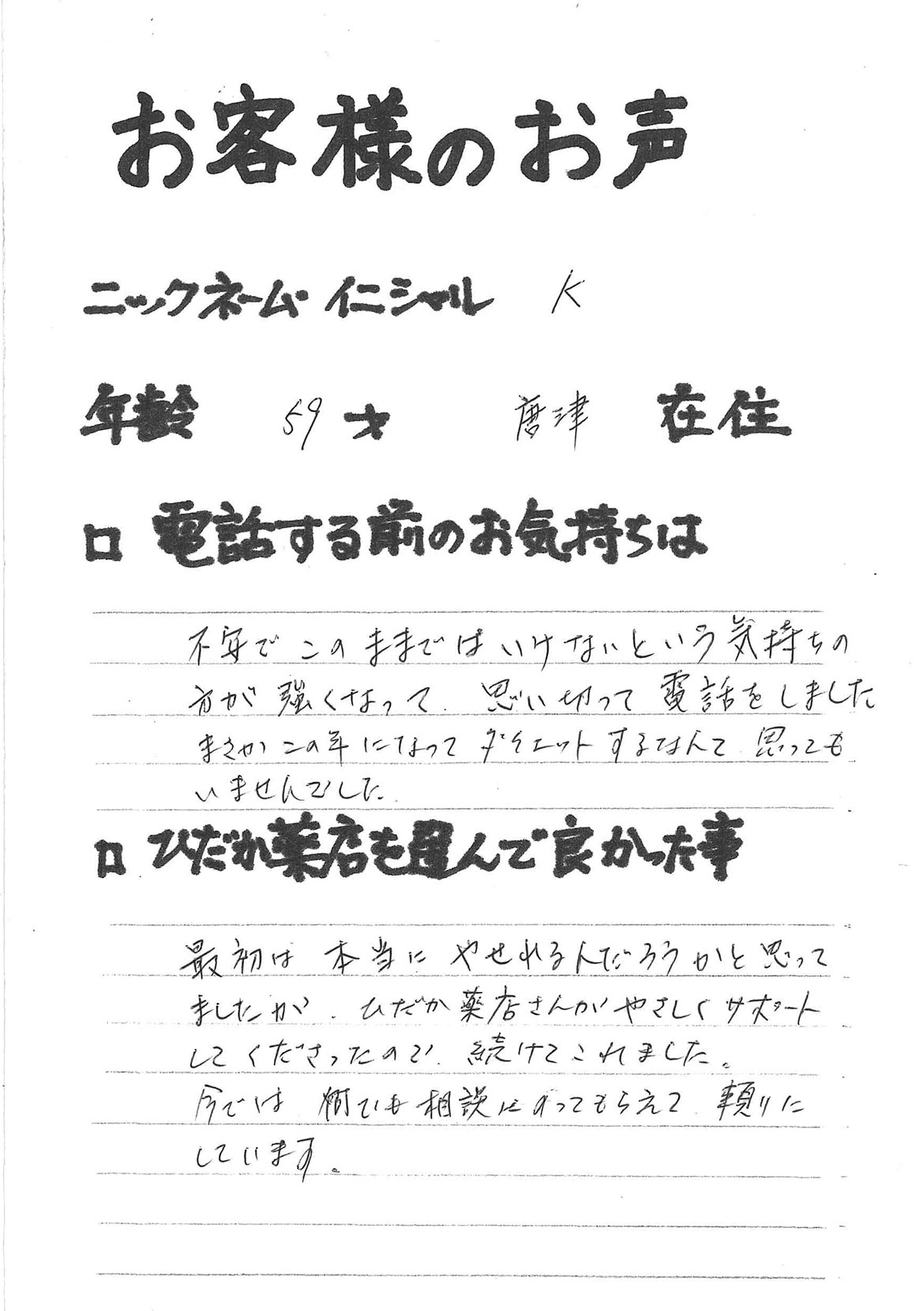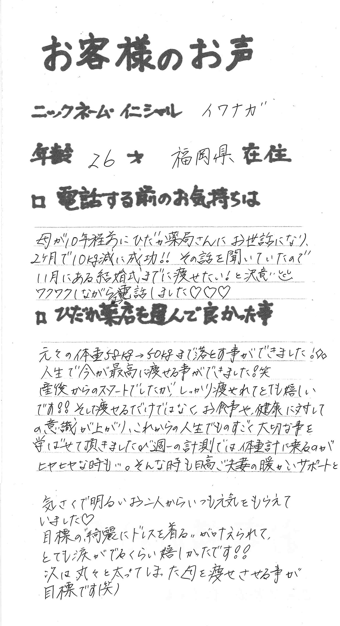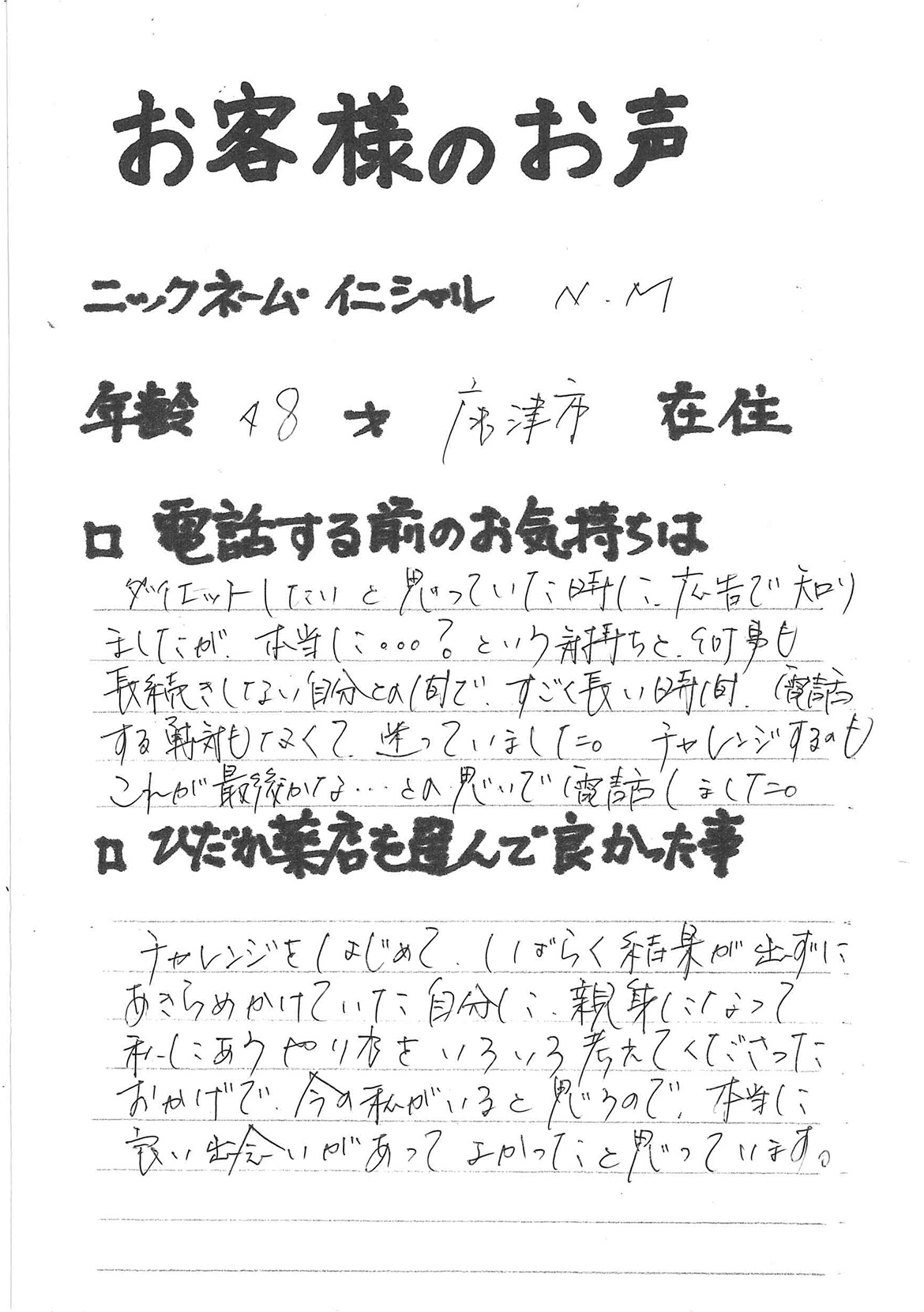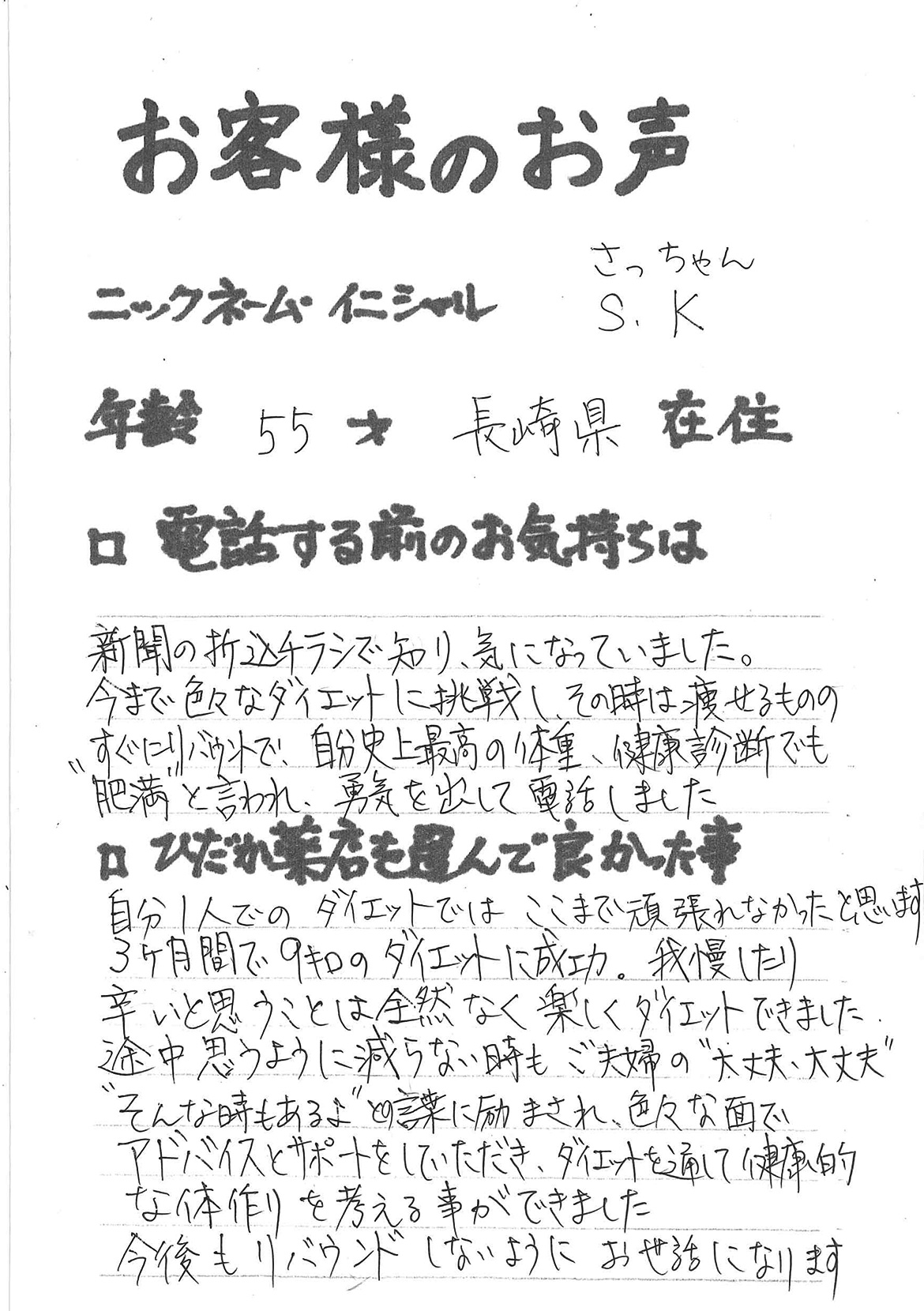 2007年53歳、まさに更年期真っ盛りの頃、今当店で扱っているダイエット商品に巡り合いました。その当時は体重計に乗るたびに1キロずつ増加。まずは、自分が試して効果があれば、積極的にお客様にも推奨できるという思いでダイエットに挑戦しました。好きなアルコールもやめず、45日間で-7キロ。後ろのチャックが上がらなかった礼服もすんなりと上がるようになるなど、身体全体が引き締まり若返ったという思いでした。70才近くになり体型は昔のままというわけにはいきませんが、今でもジーパンは、昔のサイズで履くことができます。