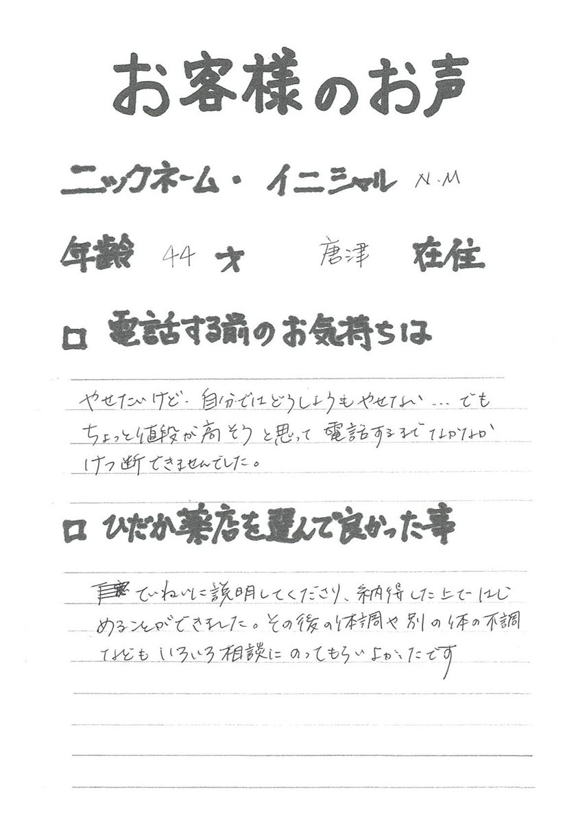 ひだか薬店では、太った原因、痩せない理由、今の健康状態などを見極めるために、しっかりとカウンセリングの時間を設けます。ご意向も伺いながら、食事や生活習慣、漢方やサプリメントなどその方に応じた最適な方法をご提案。