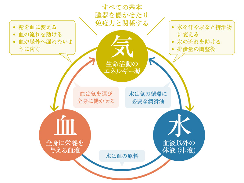 東洋医学には「気・血・水」という考え方があります。「気」は生命のエネルギー、「血」はエネルギーを循環させる血液、「水」は体液などの水分を指します。女性特有のお悩みを解決するには、これらのバランスを整えることが大切です。